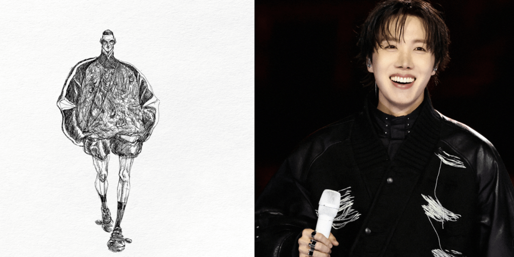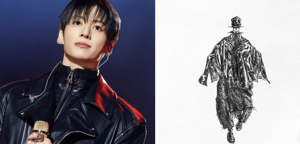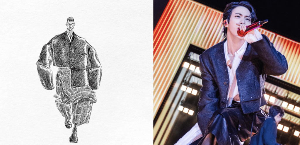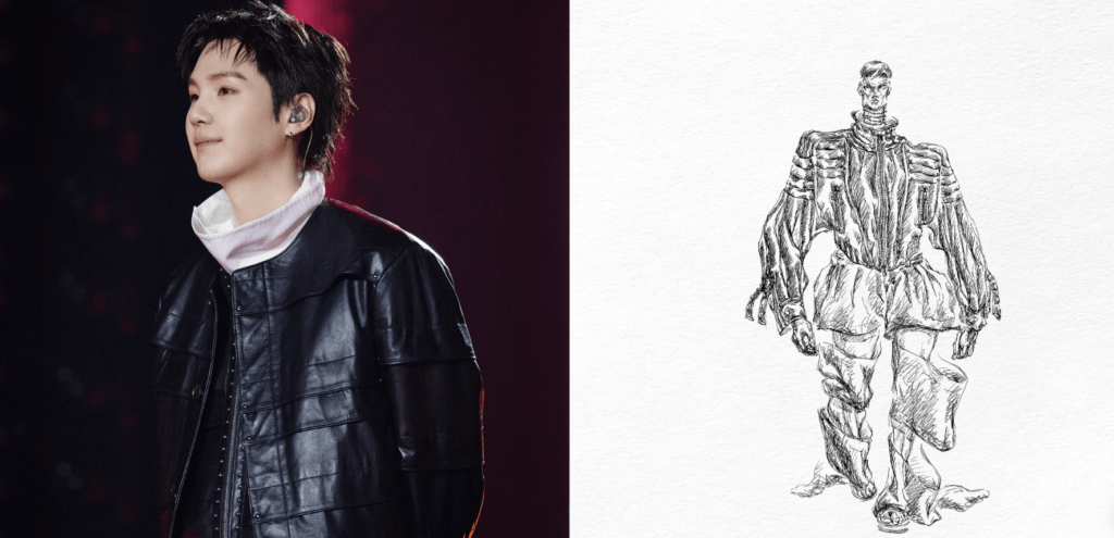 Образ RM как лидера BTS интерпретирован через корейский силуэт, подчеркивающий его силу и героизм. Плавные восточные линии плеч и многослойная конструкция с ниспадающими молниями создают выразительную форму, усиливающую его сценическое присутствие.