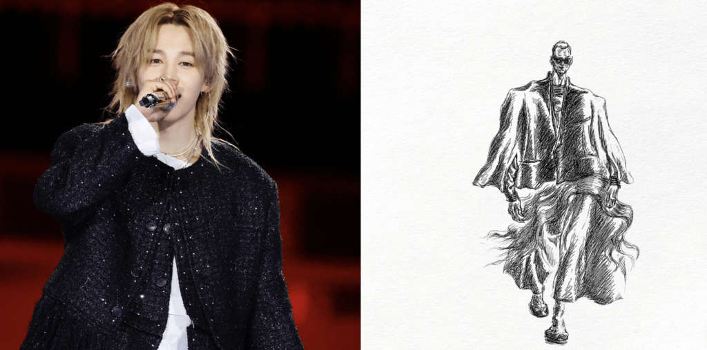Образ Чимина — это двойной жакет-доспех с текучим силуэтом ханбока и восточной декоративностью.