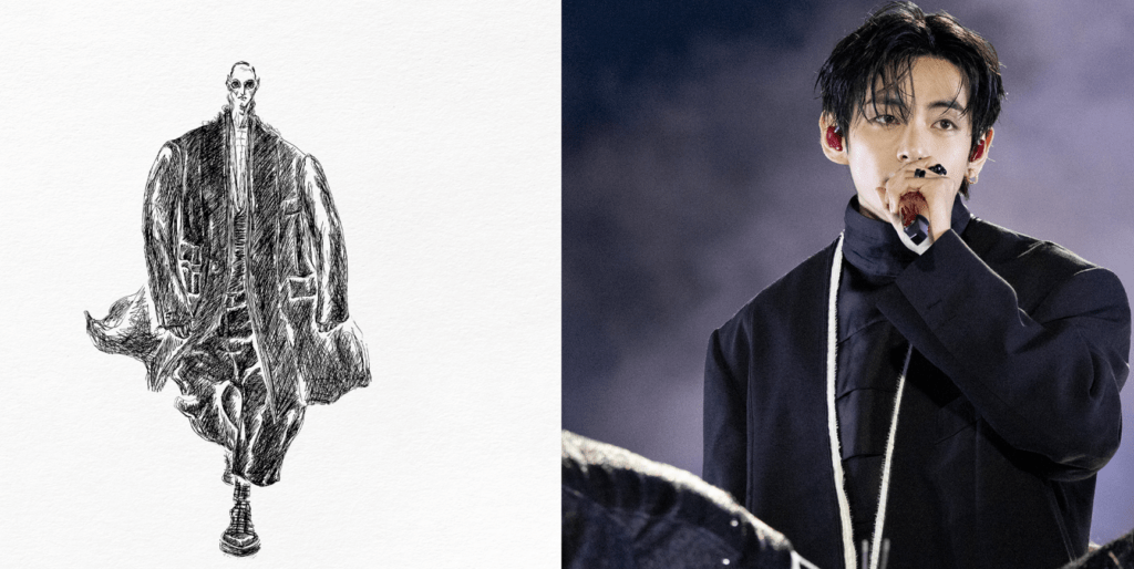 Образ сочетает сдержанную элегантность сонби и восточный тейлоринг, переосмысливая уникальную атмосферу V.